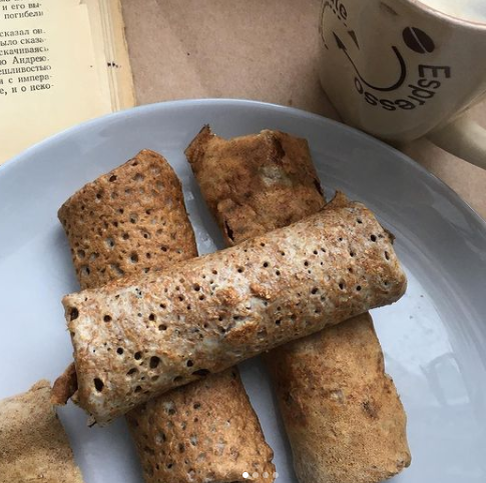 -Хорошо разогреваем а/п сковороду и перед каждым блином обязательно перемешиваем тесто, потому что клетчатка оседает