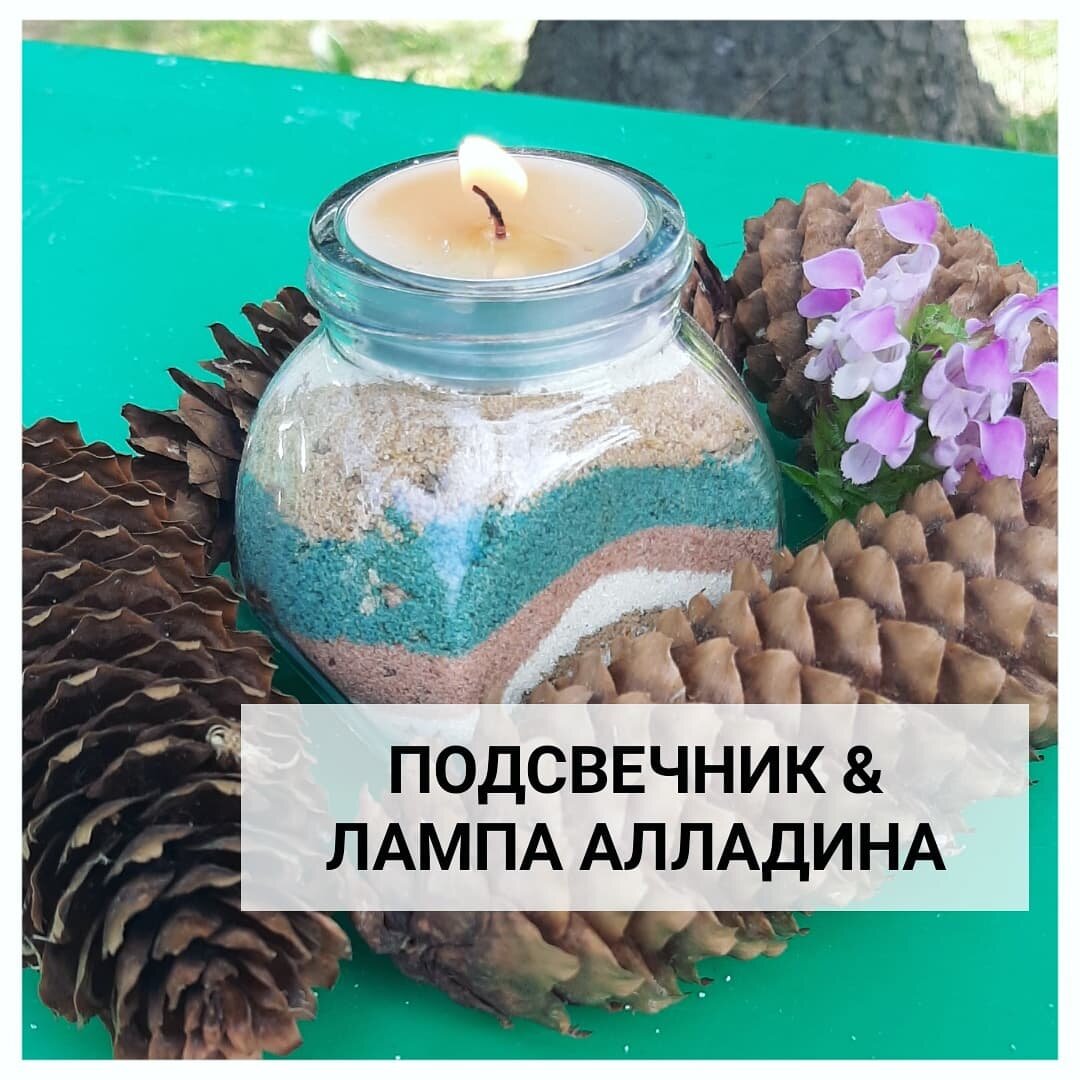 🔥 Наверняка, все знают историю лампы, в которой сидел джин, исполняющий желания🧞♂️ И вот недавео мы с детками именно такую и делали, точнее начали мы с нее, а вот слелали мы в конце концов самый настоящий подсвечник😉 Нам понадобилось: ✅Цветной песок (минимум 4 цветов) ✅Сосуд с пробкой/крышкой небольшой (лучше подлиннее) ✅ маленькая плоская свечка Берем цветной песок и поочереди засыпаем каждого цвета, так, чтобы он ложился цветными слоями! Чем больше у вас цветов, тем интереснее получается результат. Внимание!!! Засыпать нужно под самое горлышко, чтобы песок не смешивался! Если просто закрыть крышкой или украсить камушками то, вуаля, наша волшебная лампа готова!! Она станет классным атрибутом многих ролевых игр😉 А если вы хотите подсвечник, то последним этапом поставьте свечку, но так, чтобы она стояла плотно! Возможно, если у вас широкое горлышку у сосуда, ее хорошл немного закопать! И вот, классный подсвечник готов🤗 А какая идея вам понравилась больше: