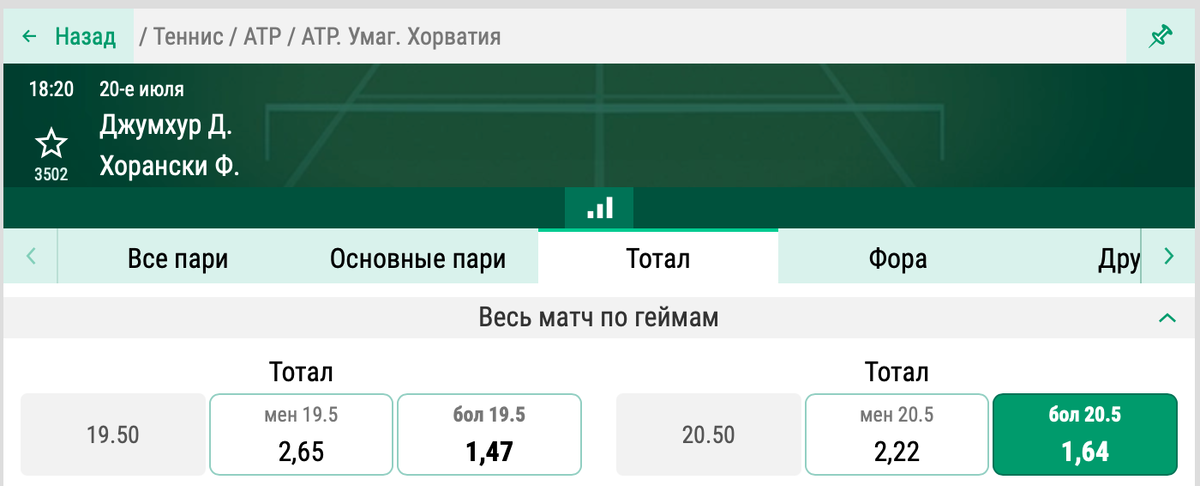 Заходим по линии на теннис. Описание к ставке: На старте плей-офф Дамир Джумхур на грунте Умага пересечется с Филиппом Хорански. В лучшие периоды карьеры Дамир мог вставить палки в колеса любому, но даже тогда не отличался стабильностью. Сейчас же редко можно увидеть толковую игру в исполнении боснийца. Хотя, хорошему выступлению на текущей неделе есть предпосылка. В рамках последнего турнира отметился четвертьфиналом и обыграл одного крепкого грунтовика. Правда, дело было на Челленджере. Филипп по ходу сезона не раз отмечался выходом в высокие стадии Челленджеров. Был даже близок к завоеванию чемпионского титула, но никогда не входил и в сотню сильнейших представителей тура. Зато в Умаге провел пару матчей квалификации, в коих хорошенько размялся и продемонстрировал полную готовность к грядущим баталиям в плей-офф. Выбор победителя данной пары сродни гаданию на кофейной гуще, потому хотим обратить ваш взор на рынок тоталов. Дамиру нужно возвращаться в ТОП-100 и по-хорошему надо проявл