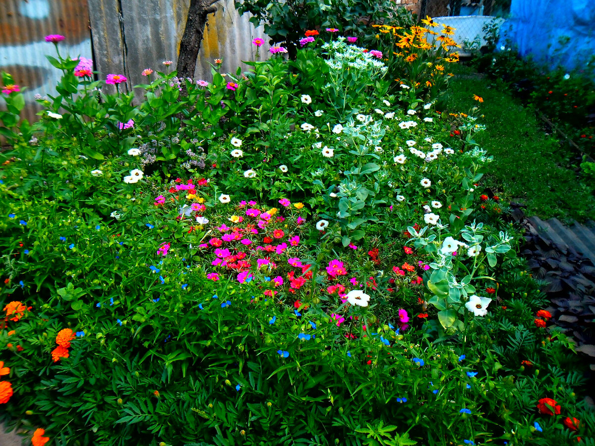 Дорогие мои друзья и гости моего канала, сегодня я приглашаю вас вместе со мной, прогуляться по моему деревенскому саду ! Я буду работать для вас гидом ! На первом фото, мы видим клумбу, в виде треугольника, здесь я почти ни чего не сею, растет само, портулак, гибискус, молочай (невеста ),традесканция и только подсеваю бархатцы и цинии )