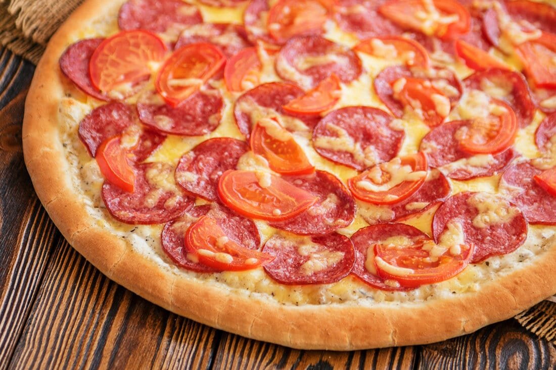 150мл воды;1 ч.л. соли;1 ч.л.сахара;1ч.л.дрожжей;250г муки; Начинка:200г колбасы копчёной;100г сыра;250г помидора;90г томат-пасты. В тёплой воде растворите сахар.Насыпьте дрожжи,перемешайте,укрыть полотенцем и оставить в тёплом месте на 10-15 минут.Добавьте соль и небольшими порциями муку,замесить тесто и оставить в теплом месте на 30-40 минут.После обомните,раскатайте в пласт по размеру используемой формыдля запекания.Смажьте томатной пастой или соусом.Уложите по всей поверхности колечки колбасы,добавьте кружочки помидора,немного подсолить.Посыпьте натертым сыром и отправьте в духовку,выпекайте 40-60 минут при температуре 180°С.Пицца готова...