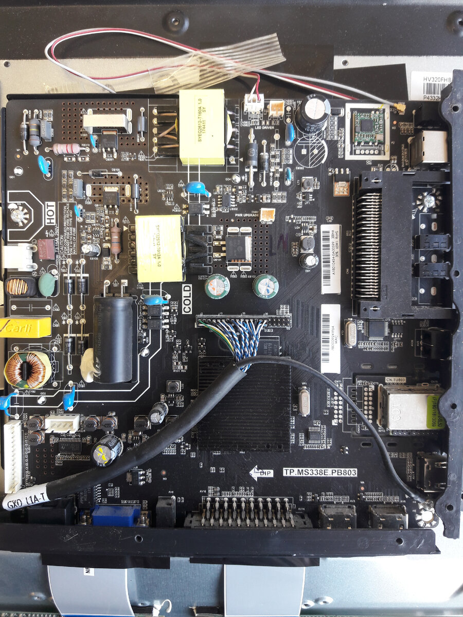 На всякий случай фото внутренностей телевизора. Как на майн плате tp.ms338e.pb803 уменьшить ток подсветки расскажу ниже.