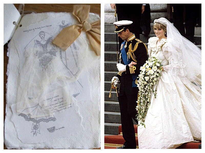 На западе существует традиция создавать памятные альбомы. Туда вклеивают фотографии, билетики, кусочки ткани, пуговки и т.д. Т.е. всё, что хранит воспоминания. Для Элизабет Эмануэль и её мужа Дэвида - дизайнеров создававших свадебное платье Дианы, работа над её нарядом - не только трепетное воспоминание. Это ещё и огромное достижение, ведь платье признано эпохальным. Поэтому, у Элизабет был памятный альбом о платье. Но люди узнали об о нём только когда Элизабет выставила его на аукцион в 2012 году. Спустя почти 30 лет. Альбом продали за 3200 фунтов стерлингов (около 300 тысяч рублей). Всего в альбоме 5 листов из бумаги ручной работы с неровными краями. На обложке - самая знаменитая черно-белая фотография, где Диана стоит вполоборота на ступенях собора Святого Павла в день ее свадьбы. Обложка окаймлена ноттингемским кружевом, используемым на лифе свадебного платья Дианы. На одной из страниц альбома есть оригинальный акварельный набросок платья. На 2 странице размещена вырезка статьи