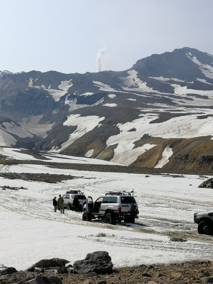 Восхождение на Мутновский вулкан начинается с довольно сложной задачи : доехать до вулкана из Петропавловска - столицы края! Сделать это можно только на джипе с большими колёсами и кучей дополнительной подвески 😆 Ехать часа 3-4. Последний участок дороги надо ехать по снегу, пытаясь объезжать "линзы", так местные называют большие лужи или даже небольшие озёра, покрытые сверху слоем голубого льда. Выглядит красиво, но тачка проваливается сразу, и дальше выбраться можно только с применением других джипов и лебёдки 😆 К счастью, взаимопомощь здесь на высшем уровне - и вытягивать провалившихся в линзу несчастных - это тут уже своего рода аттракцион и дело абсолютно обычное! Кстати колёса перед выездом на снег полагается довольно сильно спускать, а перед выездом обратно на асфальт (совершенно уникальный редко попадающийся на Камчатке объект 😆) или грунтовку - накачивать. И так каждый раз)) Вообще, Мутновский вулкан - моё любимое место на Камчатке. От города сравнительно недалеко (до бол