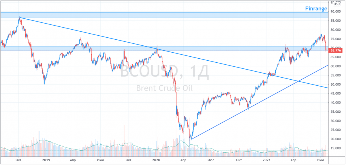 Вчера цены на нефть марки Brent упали на 6%, WTI – почти на 7%. Одна из основных причин – это решение ОПЕК+ о повышении добычи нефти с августа 2021 г. Участники картеля на выходных договорились ослабить снижение добычи с августа и увеличить нефтедобычу на 400 тыс. баррелей в сутки, а также продлить сделку о сокращении производства до конца декабря 2022 г. В планах, повышать добычу нефти до тех пор, пока не верну на рынок нефти 5,8 млн баррелей в сутки. После чего, страны ОПЕК+ будут оценивать состояние нефтяного рынка и принимать новые базовые уровни добычи для ряда стран, включая Россию. Например, добыча нефти для России будет увеличена с 11 млн до 11,5 млн баррелей в сутки. Следующая встреча стран представителей ОПЕК+ запланирована на 1 сентября 2021 г.