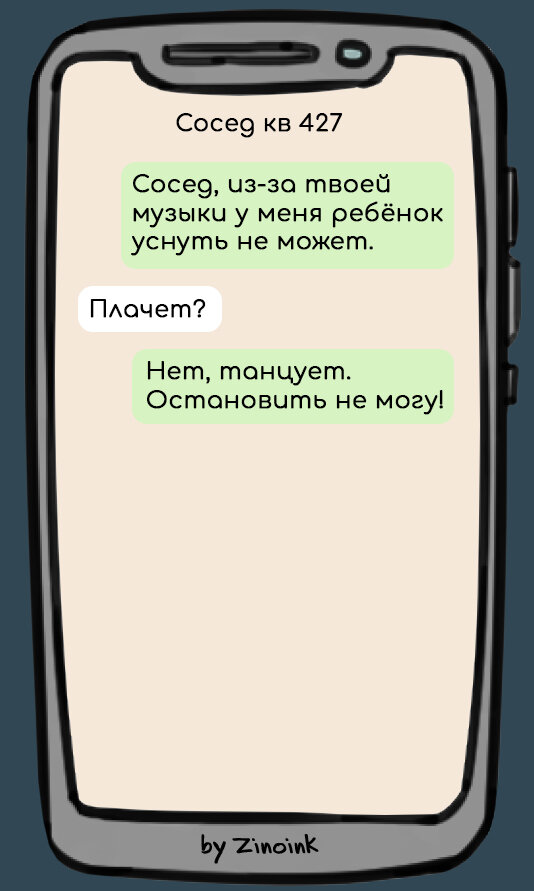 Привет, дорогой друг! Чтобы чувствовать себя хорошо, нужно уделять внимание телу, отдыхать и спать достаточное количество времени. Но далеко не всем доступна возможность комфортного сна, ведь не всем повезло иметь спокойных соседей. Если рядом с тобой живут слишком энергичные ребята, то сегодня ты узнаешь себя, если у тебя по соседству живут тихони, то тебе тоже будет весело (а еще приятно, что такие ситуации с тобой никогда не случатся). Те, кто следят за моими публикациями уже поняли, что сегодня — время для новой статьи, в которой собраны смешные #смс переписки . И как уже мог догадаться, сегодня тебя ждут #сообщения соседям. Погнали! Если в квартире живет маленький ребенок, хотелось бы, чтобы звукоизоляция в доме была понадежнее. Ведь если ты смог заставить перемещаться на цыпочках всех жителей своей квартиры, то с соседями такое провернуть практически невозможно. Если где-то очень громко отмечают праздник, у тебя есть два варианта, как на это реагировать. Первый — раздражаться, чт