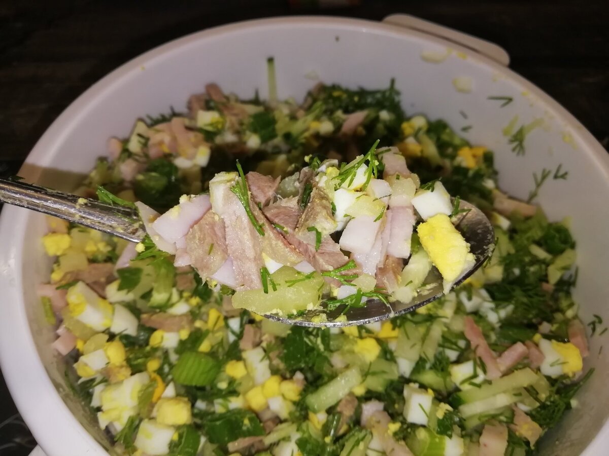 Я окрошку обожаю. И больше всего мне нравится именно мой рецепт приготовления этого холодного летнего блюда. Как мне кажется, я смогла довести его до совершенства. А потому в сегодняшней публикации хочу рассказать, как именно я готовлю окрошку. Может быть мои советы будут полезны и Вам. Не колбасой единой... Большинство кулинаров готовя т окрошку с обычной вареной колбасой или сосисками. Я уже давно так не делаю, в редких случаях. Я готовлю окрошку с ветчиной и отварным языком. Получается бесподобно. Попробуйте и убедитесь, что с этими ингредиентами окрошка получается намного вкуснее. Квас только домашний Никакого магазинного кваса. То, что в магазинах продают с этикетками "квас" даже с большой натяжкой сложно назвать квасом. К русскому традиционному напитку это не имеет никакого значения. Квас я всегда ставлю сама - на черном хлебе и сахаре. Только такой квас подаю к своей окрошке. Зелень и листья хрена Свежая зелень - укроп и лук - обязательные компоненты окрошки. Но, чтобы ок