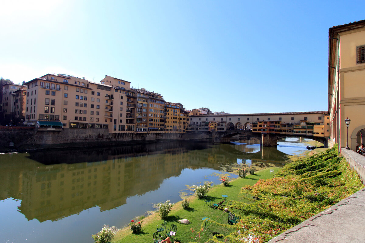 Переходим через мост Понте Векьо, с которого открывается чудесный вид на мост Санта Тринита. По дороге обратно непременно сделаем зеркальные фото (то есть с моста Святой Троицы на мост Понте Векьо)