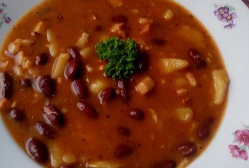 700 мл бульона прибл. Мелко нарезанный бекон обжарить вместе с луком. Если бекона немного, добавьте к луку немного масла подсолнечного или сливочного. После обжаривания всыпать паприку, муку и измельченный чеснок. Все недолго обжарить постоянно помешивая. Добавить нарезанный кубиками картофель, влить бульон и перемешать. Приправить солью, перцем и майораном по вкусу и варить, пока картофель не станет мягким. Наконец, добавьте предварительно приготовленную или консервированную фасоль и дайте ей закипеть. Подавать с ломтиком хлеба, по желанию можно добавить в суп натертый на терке чеснок или нарезанную петрушку. Приятного аппетита!