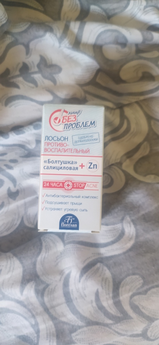 Здравствуйте дорогие читатели.Хочу рассказать вам о моей новой покупке из фикс прайс.Прыщи моя проблема с детства и что я только не делала для их избавления.В этот раз проходя в фикс прайс и увидев эту коробочку решила брать. Объём - 25 мл. Производитель: Россия, ООО "Флоресан". Место покупки:Фикс прайс. Срок годности: 30 месяцев, а после вскрытия срок годности - 12 месяцев. Цена - 55 рублей.Упаковка:Болтушка из Фикс Прайс выпускается в одном формате, в стеклянном флаконе коричневого цвета, объемом 25 мл. На флаконе имеется информация от производителя Консистенция лосьона текучая.Перед применением нужно хорошо встряхнуть Запах:Запах приятный, косметический. Из-за входящих в состав травяных экстрактов имеются ноты трав. На коже остается на достаточно длительное время Применение:Производитель рекомендует наносить это средство дважды в день, утром и вечером. Я же пользуюсь этой болтушкой только 1 раз, вечером перед сном. Наношу на ватный диск. Протираю им хорошо очищенную кожу.Ложусь сп