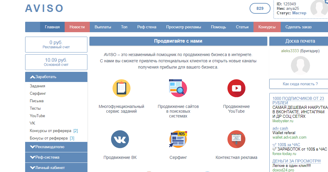 Aviso-это лучший букс для заработка..Можно зарабатывать выполняя несложные задания,смотреть видео ютуб канала, проходить тесты,читать письма, а также есть реклама.Всего очень много,можно смотреть видео хоть целый день..и нормально подзаработать.. Ютуб реклама также очень много и также часто добавляется. Раздел с легкими тестами их тоже прилично... А вот и несложные задания с хорошей оплатой. На сайте есть раздел с реферальной системой...на которой вы сможете купить реферала. Есть недорогие рефералы а также и по дороже. Всего выплат 23 -на сумму 564.61..Так что проект платит и очень радует)Все советую.Регистрация -https://aviso.bz/?r=anya25