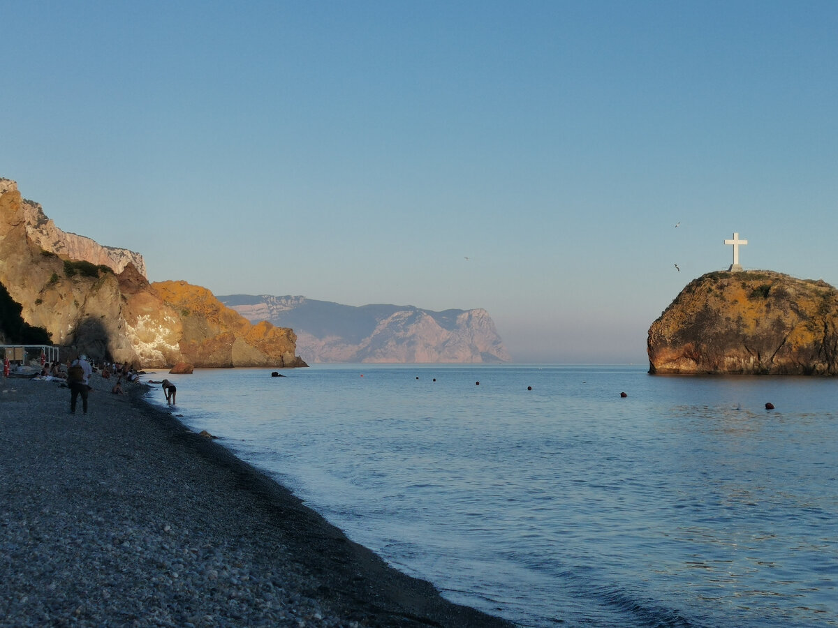 Вообще мы просто хотели покупаться. Жили мы в Балаклаве, пляжи которой в июне были очень холодными и с дохлыми медузами. Местные посоветовали нам отправиться на Яшмовый пляж, который находится недалеко от мыса Фиолент. И вот, спустя 40 минут путешествия на катере мы, обогнув очередной скальный выступ, увидели крест. мы приехали - сказал нам проводник и высадил нас на берегу пляжа. С пляжа нам открылся вид на небольшую отдельно стоящую скалу, примерно в 140 м от берега, на вершине которой стоит 8 метровый мраморный крест, установленный в 2019 году. Эта скала называется Георгиевской скалой или скалой Явления, а первый крест появился здесь в 1891 году, хотя сама история произошла за тысячу лет до этого. По легенде, в 891 году мимо проплывал греческий торговый корабль, который попал в страшный шторм. Моряки уже почти потеряли надежду, но в этот момент увидели свет и на скале появился святой Георгий, который указал им путь к месту, где можно укрыться. Когда шторм закончился, моряки подня