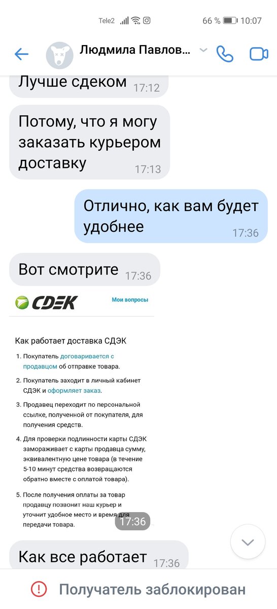 Это удивительно, но мошенники поражают своим воображением и техническими возможностиями! Меня зовут Наталья и я на днях чуть не стала жертвой развода под маской "Сдек". Я выставила игрушку на продажу на *Юле* и *В контакте * https://youla.ru/p60e21d209ae2bc15e1342dd3. И в скором времени получила письмо В *в контакте* от якобы *бабушки*, желающей порадовать внука моей игрушкой. Покупка в Москву. Ух как же я обрадовалась! На Юле я пользуюсь безопасной сделкой и отправка там почтой "boxberry", очень быстрая и недорогая. Но *бабуля* предлагает отправить "Сдеком". Тоже шикарно, думаю я. Ведь пункт отправки "Сдэк" буквально в соседнем доме. Но тут *бабуля* присылает просьбу прислать мои данные:имя, фамилию, емейл, адрес... Я несколько была обескуражена, ведь обычно нужен адрес как раз покупателя для отправки товара🤔.. Настораживает.. Но *бабуля* присылает скрин с якобы сайта "Сдек" о услуге и как она совершается... 1.Очень удивила фраза, что с Моей карты продавца заморозят сумму экви