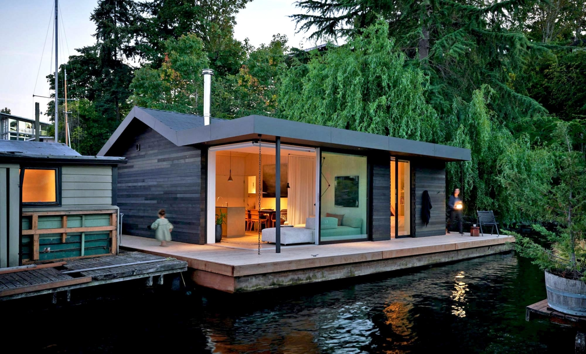 Много лет назад лодки, плоты и прочий водный транспорт Сиэтла налогом не облагали, поэтому предприимчивые жители строили свои дома прямо на воде. Со временем плавучие жилища заполонили всю округу, и экосистема водоемов загрязнилась. Тогда власти города решили ограничить количество водных построек и приравняли их статус к обычным зданиям. Большинство старых домов так и плавают до сих пор в водах Сиэтла, являясь символом этого города. Одну из таких построек купила Сюзанна Стефан, директор архитектурной компании. Ее привлекло расположение здания, дрейфующего у самого берега озера Юнион. Дом, построенный еще в 1900 году, находился в полуразрушенном состоянии. Его ремонт обошелся бы слишком дорого, поэтому архитектор решила оставить только фундамент и начать строительство собственного коттеджа с нуля. Похожий проект: Двухэтажный модульный дом-эллинг: лодочный док и жилой этаж площадью 42 м² На отлично сохранившемся плавучем основании, собранном из цельных бревен, соорудили новый дом площадь
