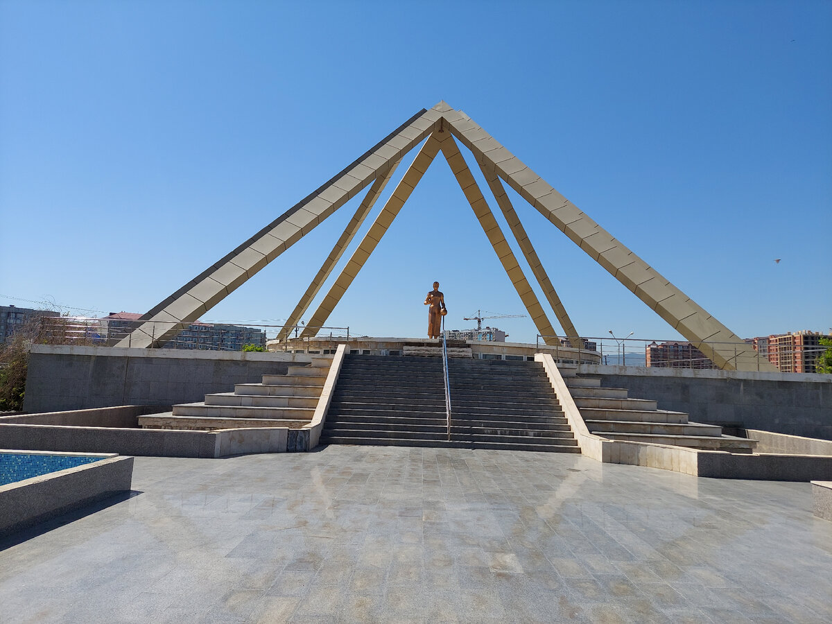 После ночёвки у «Дракона», мы поехали в парк к озеру Ак-Гёль, где расположен интересный памятник „Русской учительнице“. Открыт он был двадцать шестого августа две тысячи шестого года. Скульптура имеет десяти метровую высоту. А сам памятник изображает молодую женщину-учителя, которая в правой руке держит открытый учебник, а левая рука положена на глобусе. Этот памятник, символизирует труд русских учителей. История памятника очень интересная. Ведь как известно, в Дагестане много национальностей и у каждой свой язык или диалект. Поэтому было затруднительно общение между жителями даже соседних селений. После революции 17-го года, в Дагестан были направлены учителя для обучения местного населения русскому языку, для того что бы он стал связующим звеном в общении людей во всей Республике. Так, в тысячи девятьсот двадцать пятом году, было отправлено около тридцати учителей. Но с началом Великой Отечественной войны, ситуация осложнилась. Многих учителей отправили на фронт. Уже после войны,