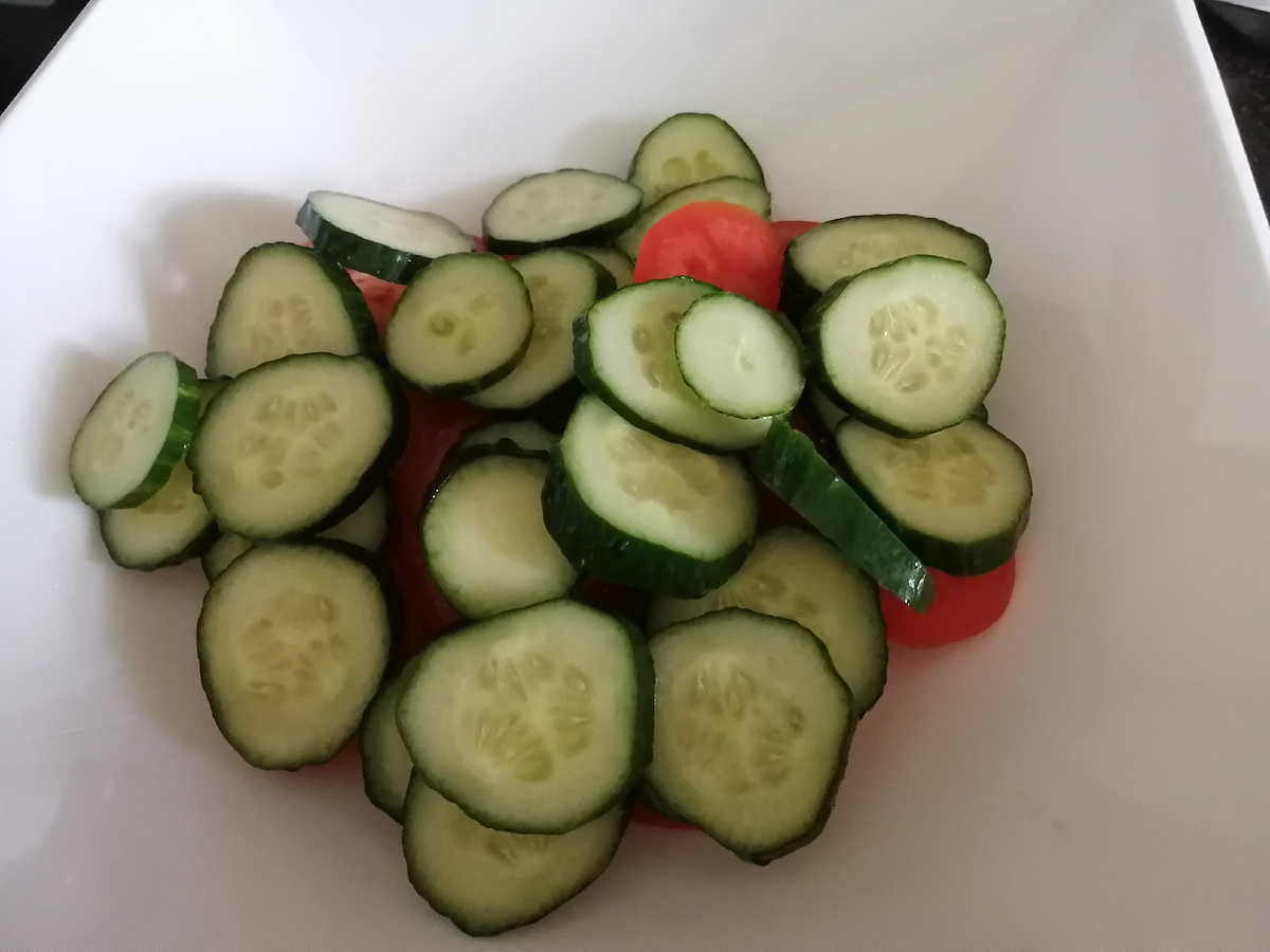 Здравствуйте! Сегодня я хочу Вас порадовать новым и простым блюдом из помидоров. Родиной этого салата является Испания. Этот замечательный салат порадует вас и в будни, и в праздники. Я уверена, вы будете его готовить каждый день и он вам никогда не надоест. Итак, приступаем к приготовлению! Подготовка этого салата займёт всего 15 минут! Состав продуктов рассчитан на 4 - 6 порций. Продукты: 5 помидоров-сливок, 1 салатный огурец, 3 сладких стручковых перца, 2-3 небольшие красные луковицы, 1 кочан салата; листья отделить, 1 яйцо, сваренное вкрутую и нарезанное кружочками, фаршированные оливки - для украшения. Для заправки: 3 ст ложки оливкового масла, 4 ст ложки винного уксуса, 1 ст ложка рубленой зелени петрушки, 1 ст ложка рубленого зелёного лука, соль и молотый чёрный перец, сахар. Способ приготовления: 1 ШАГ. Помидоры и огурцы нарезать кружочками и положить в салатник. 2 ШАГ. Стручки перца разрезать пополам вдоль и очистить от семян и перегородок. Перец нарезать соломк