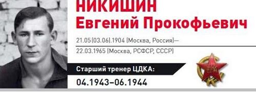 Евгений Никишин (1923-1938, 36 матчей в чемпионате, капитан команды-1936). Серебряный призер чемпионата СССР-1938. Чемпион Москвы-1935 (осень). Чемпион РККА-1938 (15 матчей). Чемпион РСФСР (в составе сборной Москвы)-1927, 1928 и 1931. Чемпион СССР (в составе сборной Москвы)-1931, 1932 и 1935. Участник матчей сборных Москвы (1925-1935), РСФСР (1925-1932) и СССР (1930-1932). Два раза вошел в список лучших игроков страны-1928 (№4) и 1930 (№2). Заслуженный мастер спорта СССР. Главный тренер ЦДКА (Москва)-1943-1944, тренер команды-1946-1947. Один из сильнейших полузащитников страны своего времени, отличался тактической грамотностью и точным пасом. Умер в 1965-м году в Москве.