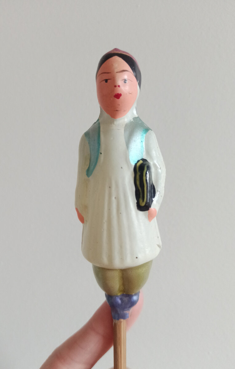 Я очень люблю серию игрушек "Дружба народов". До сих пор ищу своих идеальных персонажей. Сегодня покажу вам реставрацию освобождённой женщины востока - узбечки. А ведь и правда - если присмотреться к персонажам, то только одна узбечка в руках держит книгу. Как я прочитала в одном интересном блоге, что это обобщенный символ освобождения женщин востока. Моя узбечка не столько красива на лицо, сколько мне приглянулся сохран. Хотя и лицо у нее прописано достаточно интересно- и белки глаз есть. Досталась она мне с незначительными повреждениями ног, сходами краски на ногах и книге. Сзади глубокий скол трубочки. На одежде есть небольшие потёртости краски и кракелюр. Я сразу укрепила всю ее лаком. При этом состояние общее у игрушки очень приличное. Сначала закрасили скол краски на книге. Черный пебео и матовый медиум. Дальше нарастила трубочку и скол ножек. Наращивала как всегда эпоксидкой. Чтобы не затронуть существующий красочный слой, старую краску укрепила. И нанесла подобранный отте