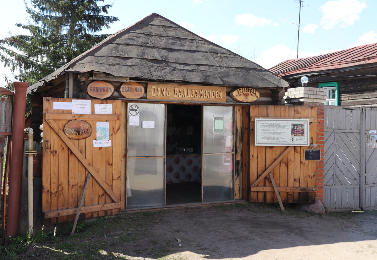 Суздаль – город исключительно фотогеничный и фильмов тут снимается много. Один из самых популярных – «Женитьба Бальзаминова». Тут даже кафе есть такое «Бальзаминов дворик». Потому что так уж получилось, что в 1964 году, когда снимали эту комедию, Замоскворечье лучше всего получалось снять именно тут. И кое-что, точнее почти все, что мелькает на кадрах в этом фильме, сохранилось до сих пор. В том числе и тот самый дом, в котором «жил» Миша Бальзаминов с мамашей. Найти его очень просто, он почти в центре Суздаля, надо только пойти после Торговых рядов в сторону Ризоположенского монастыря не по центральной улице, а по параллельной ей. И там будет ничем в общем-то не примечательный кроме вывески старый дом. Он почти такой же был и в фильме, таким же остается и сейчас. Если бы не памятная дощечка и гараж с вывеской о том, что за 100 рублей можно зайти во двор на экскурсию – запросто пройдешь мимо. Дом как дом. Ну или по Яндекс.Картам и Maps.me найти – этот домик есть среди достопримечательн