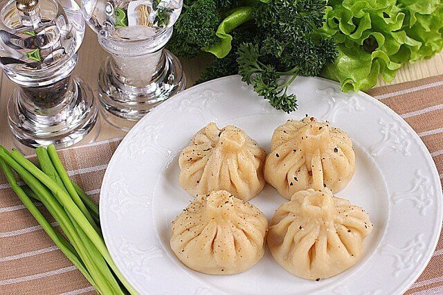 Ингредиенты: •Говядина (или свинина) — 200 г •Баранина (жирная) — 300 г •Лук репчатый (крупный) — 2 шт. •Мясной бульон — 1 стак. •Мука — 3 стак. •Вода — 1 стак. •Яйцо — 1 шт. •Соль — по вкусу •Перец черный — по вкусу Приготовление: 1. Измельчить в мясорубке мясо вместе с луком. Посолить и поперчить. Хорошо вымешивая фарш, постепенно влить бульон. Фарш должен получиться влажным и немного вязким. 2. Приготовить тесто для хинкали. На стол (или в глубокую миску) просеять горкой муку, сделав в центре углубление, добавить соль и воду. Немного взбить в стакане яйцо, добавить в тесто, размешать сначала вилкой, затем замесить тесто руками. Накрыть шар из теста салфеткой и оставить на 30 минут. 3. По истечении 30 минут вновь вымесить тесто, раскатать в тонкий пласт и вырезать лепешки диаметром 10–12 сантиметров. 4. Выложить фарш на лепешку. Собрать по кругу край, чтобы получился мешочек. Плотно слепить хвостик, поднять хинкали за хвостик и дать ему немного повисеть. Это нужно для того, чтобы луч