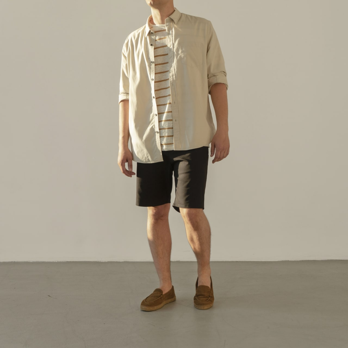 В последний месяц лета еще есть время пощеголять в легкой непринужденной одежде. Поэтому держим планку и выбираем стильные, но в тоже время удобные аутфиты. Как обычно, мы подготовили 3 образа на любой вкус со ссылками на каждый элемент. С черными шортами, светло-бежевой рубашкой и полосатой футболкой Даже банальную летнюю комбинацию «футболка+шорты» можно стилизовать под разные случаи. Берем спокойную светло-бежевую рубашку, добавляем к ней футболку в коричневую полоску, а на ноги надеваем замшевые коричневые эспадрильи, перекликающиеся по цвету с узором футболки. Получившуюся бежево-коричневую палитру разбавляем практичными чёрными шортами. Беспроигрышный повседневный комплект, особенно для тех дней, когда не знаешь, что надеть. С белыми брюками и фиолетовым поло Летом традиционную футболку можно заменить стильным поло. Мы выбрали классическую модель фиолетового цвета, которая хорошо смотрится в сочетании с белыми брюками. А темные замшевые лоферы завершают образ. Получился универсал