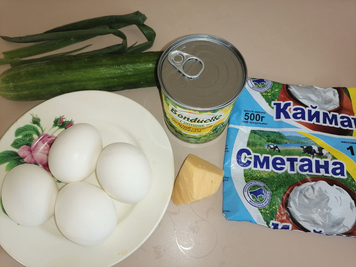 Ингредиенты : 4 отварных яйца, 100 гр сыра твёрдых сортов, 1 свежий огурец, зелёный горошек (банка), пучок зелёного лука, сметана для заправки, соль по вкусу. 1. Яйца, огурец нарезаем кубиками. С консервы сливаем жидкость. Лук мелко нарезаем. Сыр натираем на тёрке. 2. Добавляем соль, сметану (можно заменить на майонез) по вкусу, перемешиваем и подаём к столу.