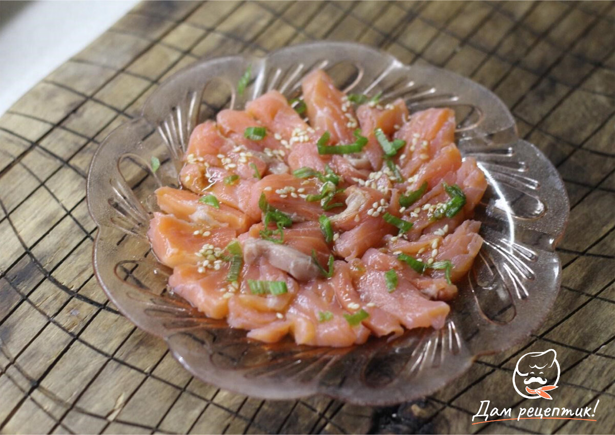 Нарезать семгу на тонкие кусочки и выложить на тарелку.