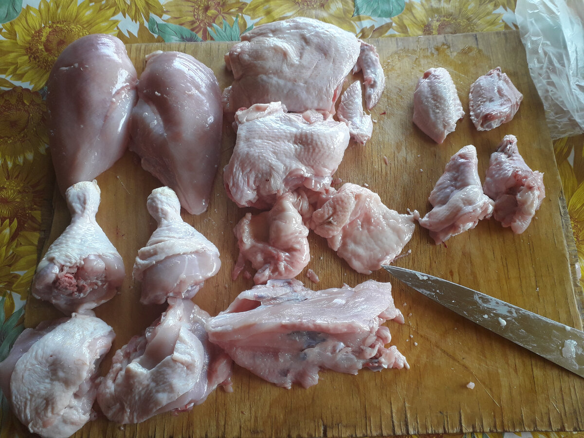 Иногда мы бываем ограничены в финансах по ряду причин. У каждого они свои. А кушать мы хотим всегда. Поэтому на арену выходит экономия. Я за разумную экономию. Берем курицу. Она может быть любого размера, но побольше все-таки лучше. Теперь отрезаем ножки и крылья. Делаем это аккуратно, по суставам. Теперь грудку отделяем от спины. Кожу и если есть жир не выкидываем, они нам пригодятся. С грудки удалить кожу, мясо отделить от кости. Крылья и ноги разделить по суставам. Из спинки, лишней кожи, жира, костей от грудки можно сварить наваристый куриный бульон. Кожу и жир после варки, удаляю. Из филе грудки можно сделать фарш, а можно наггетсы, а можно отбивные. Выбор ограничен только вашей фантазией. Ножки и крылья можно обжарить, получается не плохое второе. Для семьи из трех человек будет достаточно. Кстати, суповые кости можно разделить на 2 раза. И будет 2 бульона. Из одной курицы можно сделать 2 супа и 2 вторых. Вполне экономно и разумно. ЕСЛИ ВАМ ПОНРАВИЛАСЬ МОЯ СТАТЬЯ, СТАВЬТЕ ЛАЙК.