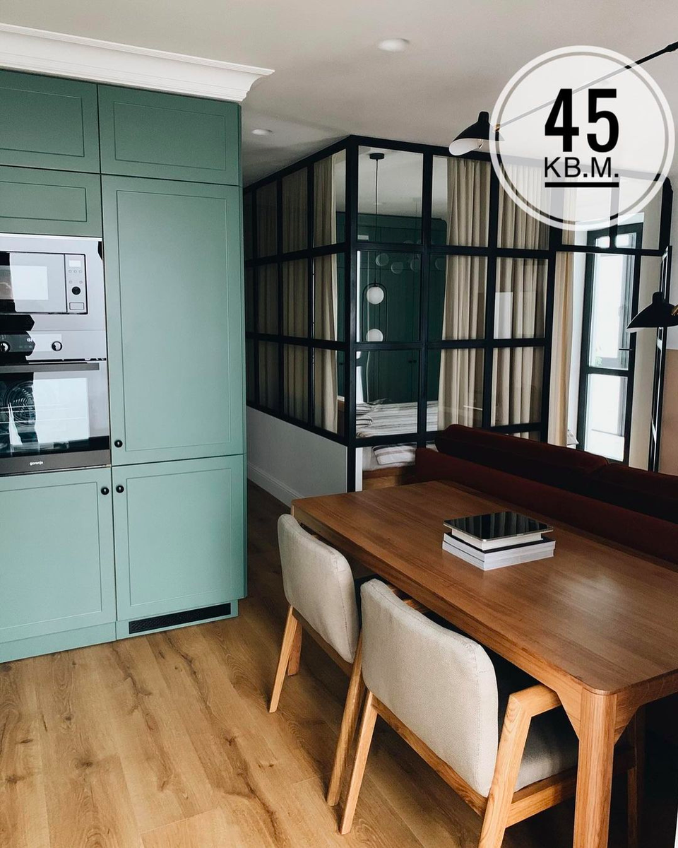 Уже на заглавном фото видно, что зонирование здесь отнюдь не условное, хотя планировка студийная, открытая. Но больше всего нас поразило сочетание моноцвета – очень красивый оттенок зеленого начинается от самой входной двери и проходит через всю квартиру – и узких изломанных проходов, которые и коридорами-то назвать трудно. А в целом выглядит уютно – такие вот спецэффекты.
