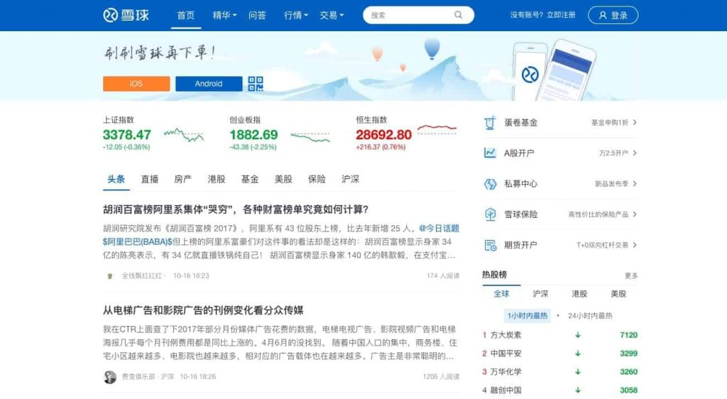 Xueqiu - это платформа, предназначенная для инвесторов, чтобы они могли обсудить и узнать больше о различных финансовых активах. Платформа сообщила, что в июле 2018 года у нее было 12 миллионов активных пользователей в месяц, когда она получила инвестиции от Ant Financial, подразделения финансовых услуг Alibaba. Учитывая нишу, в которой он работает, невероятно впечатляет то, что ему удалось достичь таких показателей. Инвесторы могут изучать данные по фондовым рынкам США, Гонконга и Китая, а также по нескольким облигациям, фондам, трастам и биткойнам. Пользователи могут получать актуальные оповещения, бюллетени новостей и изменения цен на самой платформе. Они также могут следить за другими инвесторами, общаться с ними и обсуждать инвестиционные стратегии на крупных форумах. Однако платформа пока не предлагает брокерских услуг, но планирует это сделать в будущем. Это позволит пользователям покупать акции и торговать ими непосредственно на платформе, что еще больше повысит ее привлек