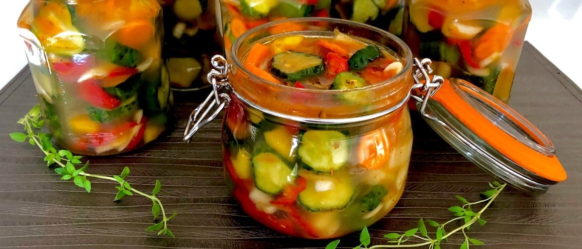 Изумительный салат из огурцов в рассоле со специями для гирос. Я слышал много похвал об этих огурцах, поэтому решил тоже попробовать, и скажу вам, что это очень вкусно! Ингредиенты: Вымойте огурцы и нарежьте их толстыми ломтиками Выложите нарезанные огурцы в большую миску и присыпьте солью. Очистите и нарежьте морковь кольцами . Лук нарежьте некрупными кусочками. Перец (в моем случае два красных и один желтый) нарезаем крупными кубиками. Все нарезанные овощи выложите в миску с овощами. Все тщательно перемешиваем. Затем в миску насыпьте сахар, добавьте уксус, масло и специю для гирос. Все тщательно перемешиваем. Подготовленный рассол перелейте в миску с овощами и все тщательно перемешайте. Откладываем все на 6 часов. Время от времени перемешиваем овощи. Поначалу рассола будет недостаточно, но со временем овощи выпустят сок и появятся соленья. По истечении этого времени огурцы вместе с маринадом переложите в банки. Закройте банки и пастеризуйте их. Пастеризацию можно пров