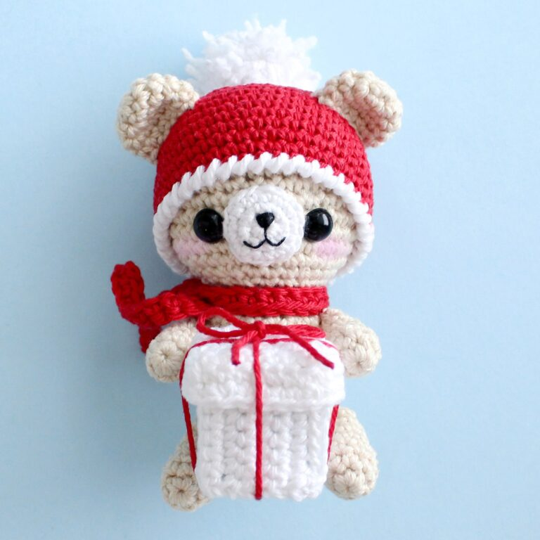 Вязаный мишка амигуруми крючком с подарком от Amylie Freeman.