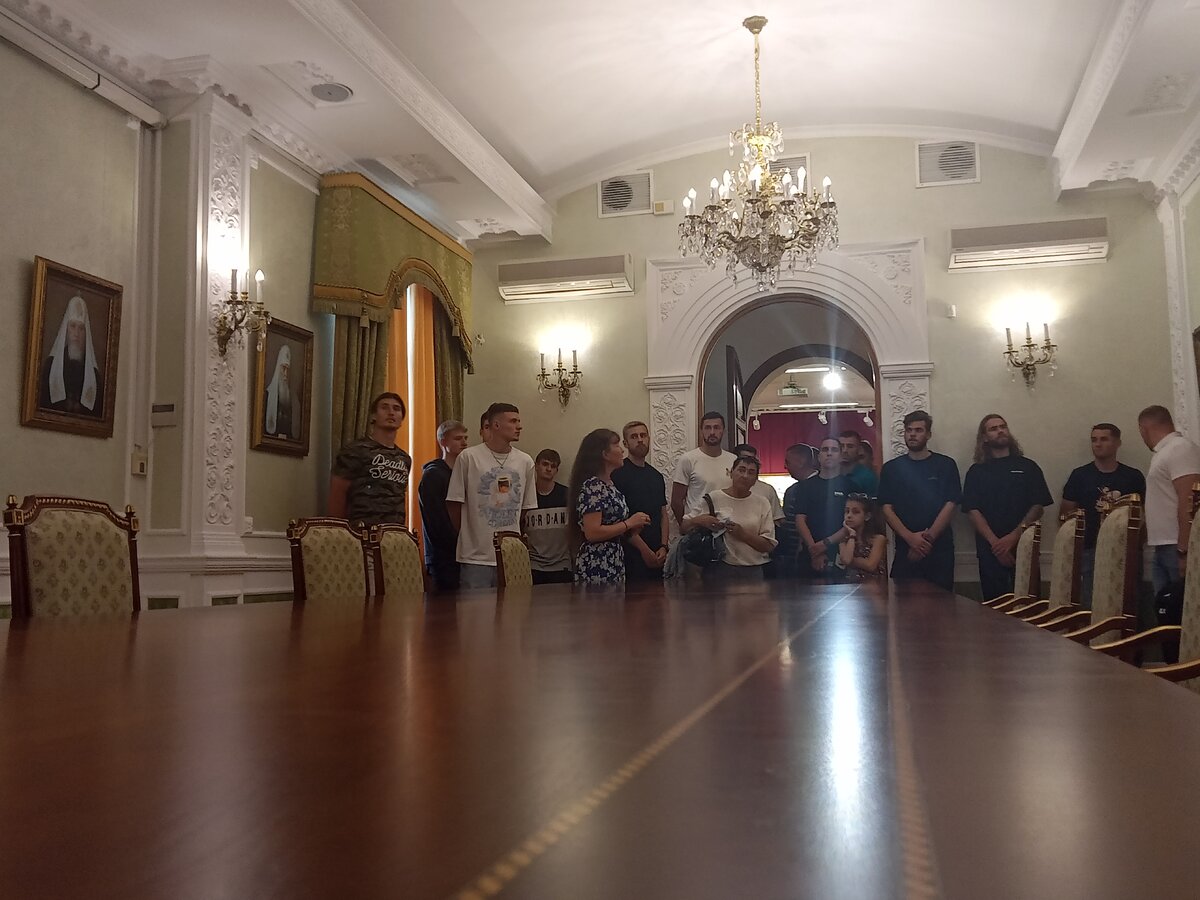 В завершении экскурсия прибыла в зал с накрытыми столами. Отец Максим по старой русской традиции пригласил отведать чем бог послал. В этот день бог послал неумеренное количество булочек с повидлом, творогом, начинками, добавил к ним эклеры, конфеты, халву с миндалём, а также хороший выбор фруктов – черешню, персики, яблоки, сливы. Из напитков были вода и чай. Стесняясь, команда подошла к столам и наискромнейшим образом вкусила дары. Проще говоря, выпили водички, скушали самую малость фруктов и более ничего. Мучное и сладкое остались без внимания футболистов. Но так как я не футболист "Урала", с удовольствием отведал вкуснятины с некоторым из персонала клуба, кому бегать необязательно.