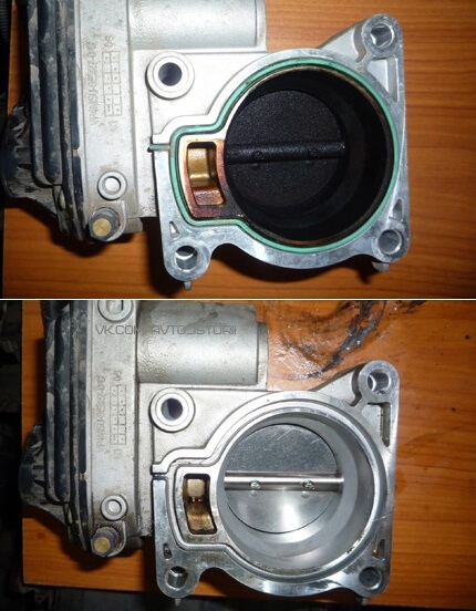 4) Использовать щетки, а не мягкие материалы. Такая ошибка тоже довольно часто приводит к потере работоспособности ДЗ, поскольку на некоторых дроссельных узлах внутренняя стенка и заслонка покрыты молибденом для ещё более гладкого прохождения воздуха. Этот слой зачастую путают с налетом и удаляют. Как результат — заслонка начинает либо «закусывать», либо пропускать лишний воздух (повышаются обороты).