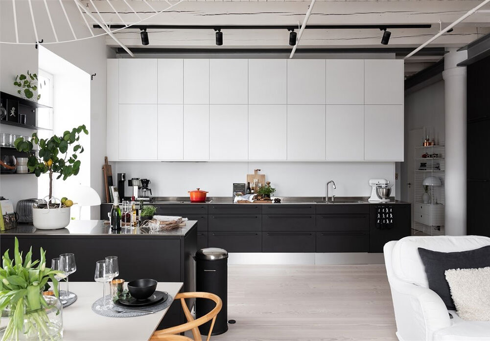 Так как сканди — это светлые интерьеры, в которых преобладает белый цвет, чёрная кухня в скандинавском стиле встречается сравнительно редко. Если чёрный и используется в их оформлении, то лишь на одной акцентной стене.