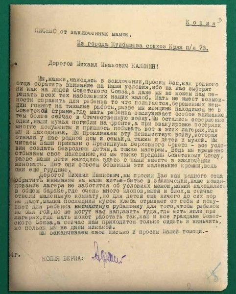 Мы, мамки, находясь в заключении просим Вас, как родного отца обратить внимание на наши условия, ибо на нас смотря ни как на людей Советского Союза, а даже мы не можем Вам передать всех тех наболевших наших жалоб. Мать не имеет возможности справить для ребенка то, что полагается, беременных женщин гоняют на тяжелые работы, разве мы женщины находимся не в Советской стране, где мать ребенка заслуживает особое внимание тем более сейчас в Отечественную войну. Мы остались совершенно одни, наши мужья погибли на фронте, а при эвакуировке потеряли многие документы и пришлось побывать вот в этих лагерях, где мы и находимся. Мы проклинаем эту ненавистную войну, которая отняла у нас родной дом и семьи, а также и детей и мужей. Мы читаем Ваши приказы с Президиума Верховного Совета- все условия создать безродным детям, а также матерям. Ведь мы временно отбываем наказание, но также преданы Советскому Союзу, разве наши дети находясь здесь с нами вместе в заключении виноваты. Нет они совсем безвинны э