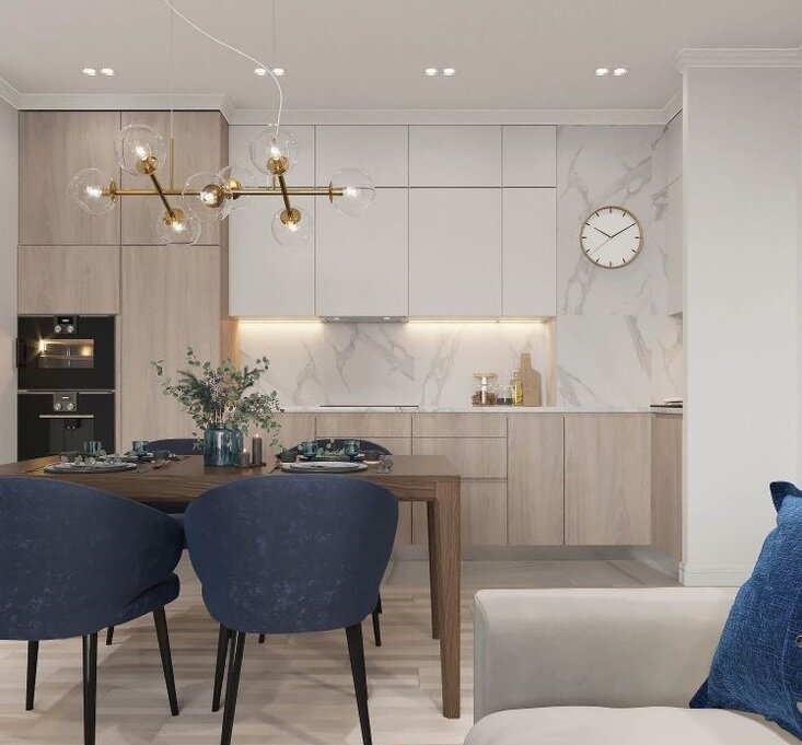 Современная кухня белая с деревом и поверхности под мрамор — актуальное сочетание.
