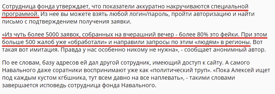 Так, в феврале 2019 года одна из сотрудниц ФБК* призналась, что на сайте «Профсоюз Навального» накручивают фейковые жалобы врачей: по ее мнению, с проектом произошло то же, что и со всеми остальными – пока Навальный «пытается развести бюджетников на донаты, его самого разводят статистикой», что показывает блогера очень слабым руководителем, мало что замечающим в своем «кружке почитателей».
