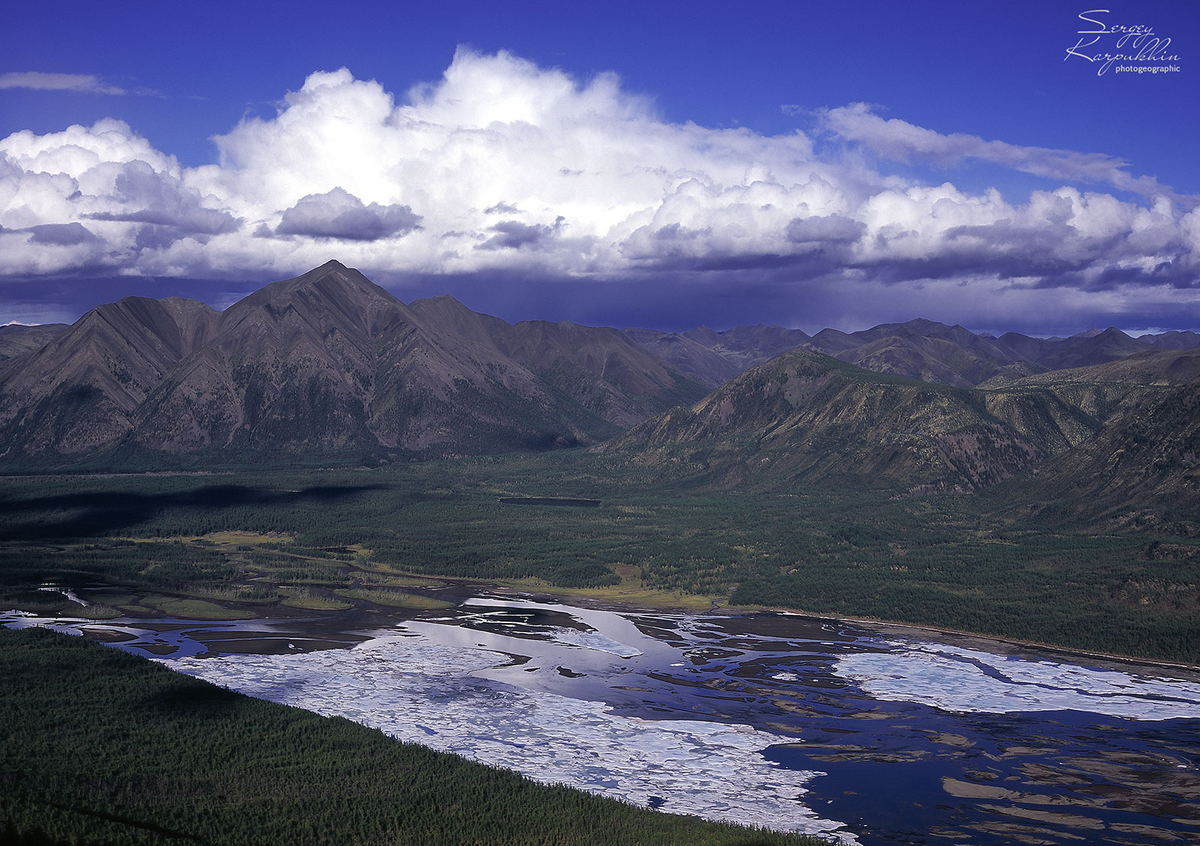 На реках в горах Сунтар-Хаята наледи встречаются довольно часто. На реке Сунтар их несколько в разных местах. От дороги до первой наледи мы шли около двух недель, несмотря на небольшое расстояние. К этому времени силы уже значительно исчерпались и на какие-то активные действия кроме переноски груза, их уже оставалось не очень много. Но здесь я заставил себя подняться наверх, чтобы снять великолепную панораму долины Сунтара, с лежащей внизу наледью. Да и небо подыграло красивыми облаками.