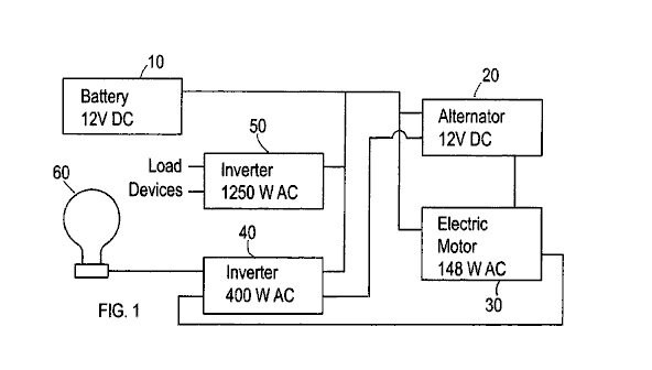 в дополнение к показанной на рисунке батарее для обеспечения начального питания системы. В первоначальную модель настоящего изобретения включен генератор переменного тока от Isuzu Trooper 1997 года выпуска. Изобретение включает в себя электродвигатель 30 (148 Вт переменного тока). Электродвигатель подключается к инвертору 40 (400 Вт переменного тока). Система также содержит второй инвертор 50. Аккумулятор 10 также подключается к обоим инверторам 40 и 50. Каждый инвертор имеет два выхода. Для первого инвертора 40 один выход подается на электродвигатель 30 для обеспечения комбинации электродвигателя и генератора переменного тока. Другой выход подается в ламповое устройство 60. Ламповое устройство представляет собой 60-ваттную лампу переменного тока. Это ламповое устройство изменяет ток, идущий от инвертора 40, так что ток, подаваемый в электродвигатель 30, не является чисто индуктивным.