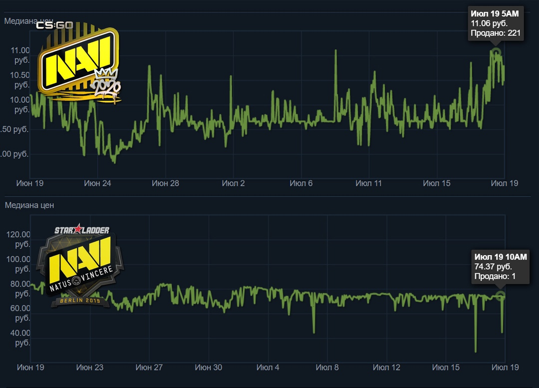 "Natus Vincere" стали чемпионами IEM 2021. Они обыграли коллектив "G2" со счётом 3-0 и забрали 400.000$ в качестве призовых!👍 На фоне события усилился спрос на наклейки и они выросли в цене. Обычный сценарий в таком случае. Самое интересное, что выстрелил только "РМР". Тот же "Берлин 2019" вообще не шелохнулся, как и наклейки других годов. Абсолютно такая же ситуация и с командой "G2". Выросли только самые свежие стикеры. И что с этим делать? Может купить, пока растёт? Докупать однозначно НЕ стоит. Такой "буст" длится максимум несколько дней. После этого цены стабилизируются. "Нави" упадут на 1-2 рубля, а "G2" на 0.5-1₽. Как пример - "G2" в голографической версии уже опустились. Продавать смысла тоже нет. Зафиксировать прибыль не получится, буст получился слишком маленьким. Если хочешь выйти из инвестиции - хороший момент, но если закинул на длительное время - сиди спокойно и занимайся своими делами. И кстати, у "РМР" есть перспективы. Так же пиши, что ты думаешь на этот счёт и смотр
