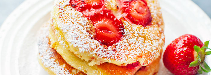 - Когда блины немного подрастут, вдавите в тесто около 4 ломтика клубники. Переверните и обжарьте до коричневого цвета за такое же время, как и раньше. Посыпать сахарной пудрой.