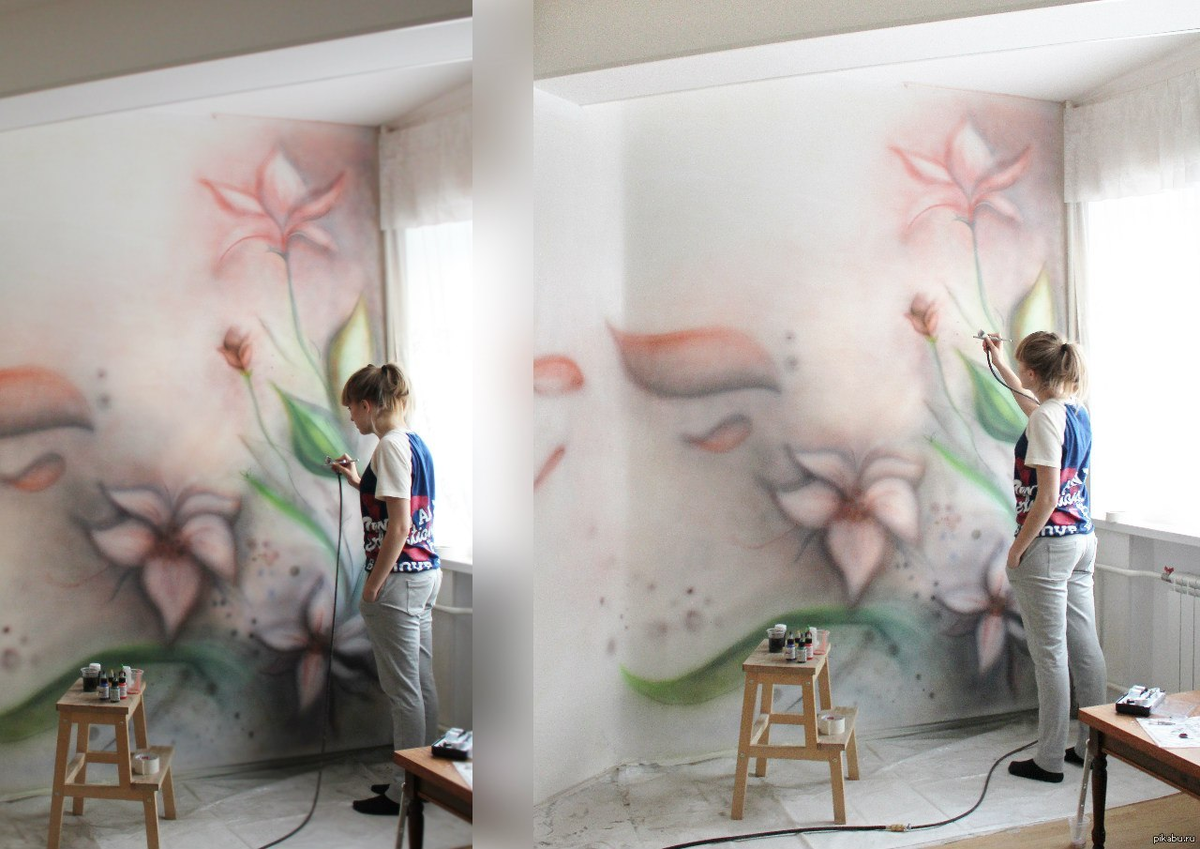 Хотя сеичас я сторонник более современных технологии для наружнои отделки, но там где это не нужно предпочту материал подешевле и попроще... в данном случае у нас стена, выходящая к соседям.А вот техника нанесения не скажу что проще и легче...помню, как 9 лет назад, я увидела процесс, и очень хотела научиться, но мне казалось это сложным... я тогда умела только шпаклевать и то с трудом понимала что такое плоскость, больше доверяла интуиции и глазу А тут нужно было понимать куда полетит эта капля и как она ляжет, и главное чтоб не полетело многопотому что будет залито, и ничем кроме гвоздя и то калично в итоге не спасешь ситуацию.И тои зимои мне пришла в голову странная идея как понять сам принцип этои техники. Итак, я взяла спицу и зубную щетку и стала беспощадно забрызгивать этим аэрографом альбомные листы в несколько слоевуже на третьем листе я поняла что на стене у меня тоже получится и да, спустя какое-то время, благодаря одному очень спокоиному и терпеливому бро, я уже закиды