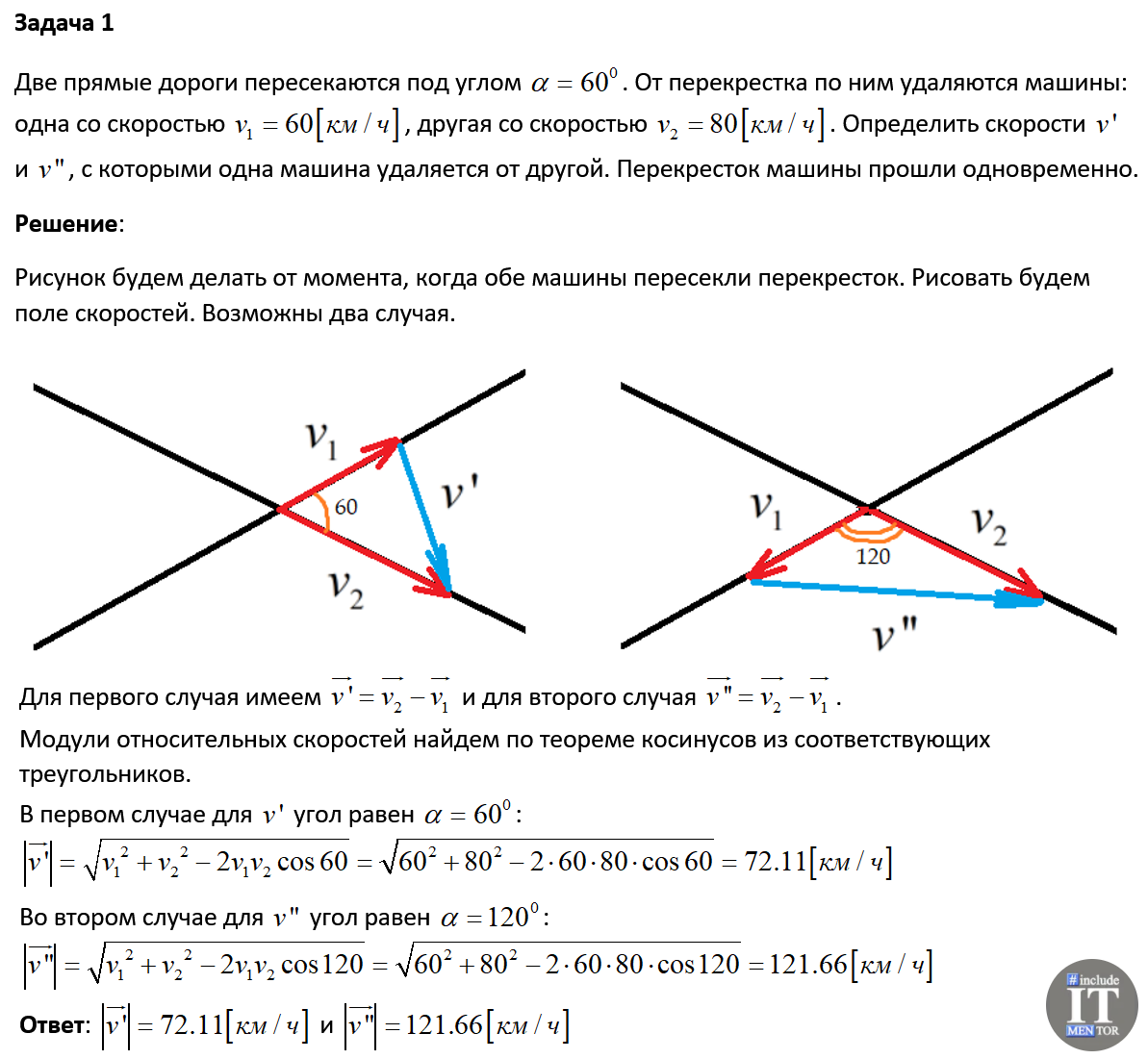 В этой заметке разберем решение некоторых типовых задач по физике. Из таких задач может состоять типичная семестровая работа для студентов. Решения всех задач я постараюсь привести наиболее подробные. Если у вас возникнут вопросы или замечания, то пишите их в комментариях к статье. Приветствую вас, друзья! Вы читаете мой блог с заметками репетитора. Здесь я пишу о физике, математике, программировании, о способах заработка в интернете и чуть-чуть о финансовой грамотности. Ошибаюсь и исправляюсь, постоянно учусь сам и учу других. А теперь погнали... Задача 1 Две прямые дороги пересекаются под углом α = 60°. От перекрестка по ним удаляются машины: одна со скоростью v₁ = 60 (км/ч), другая со скоростью v₂ = 80 (км/ч). Определить скорости v' и v'', с которыми одна машина удаляется от другой. Перекресток машины прошли одновременно. Задача 2 Движение точки по кривой задано уравнениями x = A₁⋅t³ и y = A₂⋅t, где A₁ = 1 (м/c³) и A₂ = 2 (м/c). Найти уравнение траектории точки, её скорость v и пол