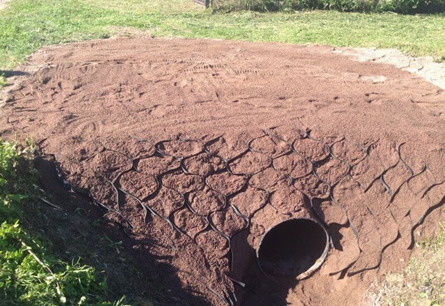 - На дно канавы укладывается геополотно. Это не позволит песку сверху не уходить в нижний грунт.