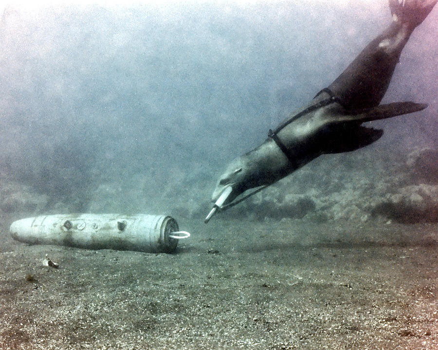 Задача – поиск Долгое время боевые дельфины воспринимались как дельфины-убийцы. Поговаривали, что млекопитающих учили не только обнаруживать, но и уничтожать диверсантов, пользуясь тем, что добродушные дельфины не могли отличить игровую ситуацию в тренировочном бассейне от вполне реального боевого задания. Специально обученные животные несли на своих спинах мины, которые взрывались, когда они подплывали к кораблям противника. Таким образом было потоплено очень много вражеских судов. Не исключено, что изначально такие эксперименты проводились, но вскоре сошли на нет. Как утверждают специалисты, дельфин настолько человеколюбив, что убийство приводит к длительному стрессу, а иногда и отказу от дальнейшего выполнения приказов. Впрочем, от работы с диверсантами дельфинов это не освобождало. Те, кто принимал участие в работе севастопольского центра в советские годы, вспоминали, что при обнаружении пловца дельфин должен был сорвать с него маску и вытолкнуть на поверхность. Точно так же звер