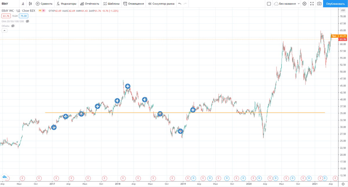 Когда продавать? Перед тем как принять решение о продаже ценных бумаг ответьте себе примерно на тот же вопрос что и при покупке ценных бумаг. Почему вы хотите продать эту ценную бумагу? Желательно чтобы у вас был обоснованный ответ! Может быть вам понадобились денежные средства и вы выводите часть капитала со своего инвестиционного счета. Может быть вы достигли поставленной цели и продаете бумаги! Или продаете для инвестирования в другие более перспективные ценные бумаги. Помните что хopoшиe компании ocтaютcя таковыми дaжe в пepиoды падения рынка. Акции Ebay падали с 2018 по 2019 года. И решение продать такую бумагу только на основании того что она весь год падает было бы не совсем верным решением без фундаментальной оценки компании. Не стоит продавать акции только лишь: Когда действительно стоит подумать о продаже акции: ------------------------------------------------------------------------------------------------- В заключении еще раз хочется отметить что при принятии любых решен