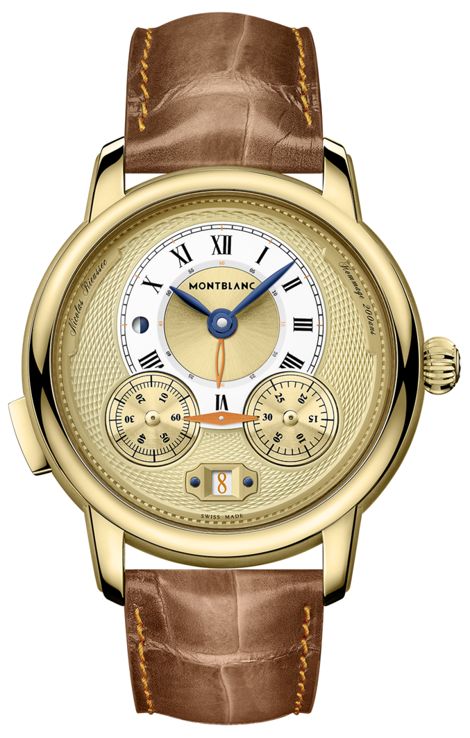 По этому особому случаю Montblanc впервые разрабатывает деревянную реплику исторического чернильного хронографа 1821 года авторства Николя Риуссека. Навеянная образом оригинального устройства реплика изготовлена из капа орехового дерева и дополнена двумя вращающимися дисками из белой эмали, которые можно легко привести в движение и остановить с помощью пушера, расположенного в левой части устройства. Сброс показаний выполняется вручную поворотом дисков к центральной оси, точно как в оригинальном устройстве.