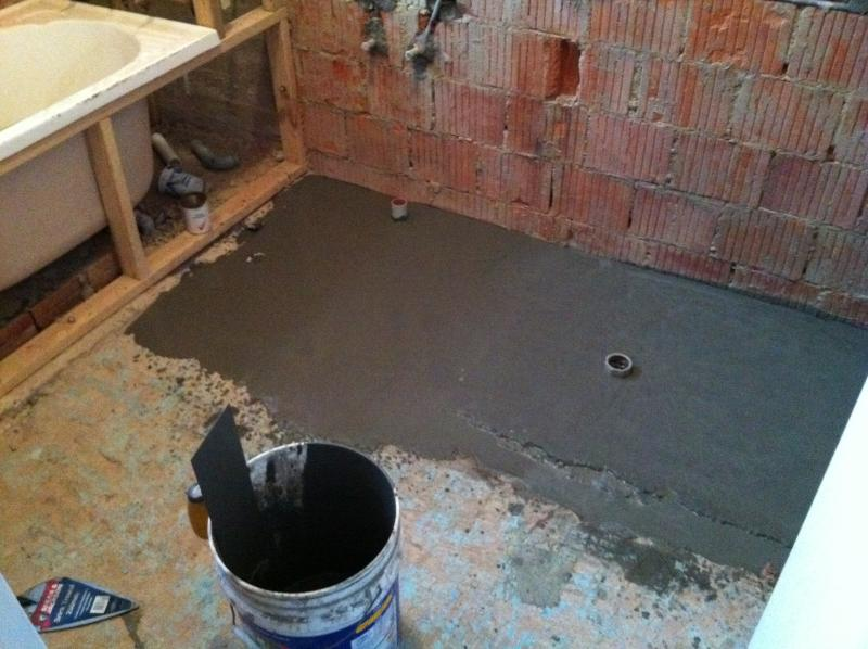 Для обустройства пола в ванной порой приходится затратить невероятно много сил. Во многих случаях требуется получить полностью ровное основание, на которое затем будет укладываться напольное покрытие. Чтобы сделать это, обычно прибегают к заливке стяжки из бетона. Но, как и говорилось, в ванной комнате подобные работы проводятся с определенной спецификой, которую приходится учитывать. Первым этапом, как и обычно, является устранение старого покрытия и той основы, которая под ним находится. «Голый» пол должен быть вычищен не только от грязи, но еще и от грибка. Если он отчетливо обнаруживается, то поражение считают, а затем проводят обработку антисептиками в целях дальнейшей защиты от грибка. Затем необходимо позаботиться о том, чтобы влага, которая для ванной является обыкновенным делом, не смогла проникнуть к бетонную перекрытию. Для этого потребуется покрыть пол гидроизоляцией. Простейшим вариантом гидроизоляционного слоя станет полиэтилен. Но лучше все-таки выполнить гидроизоляцию