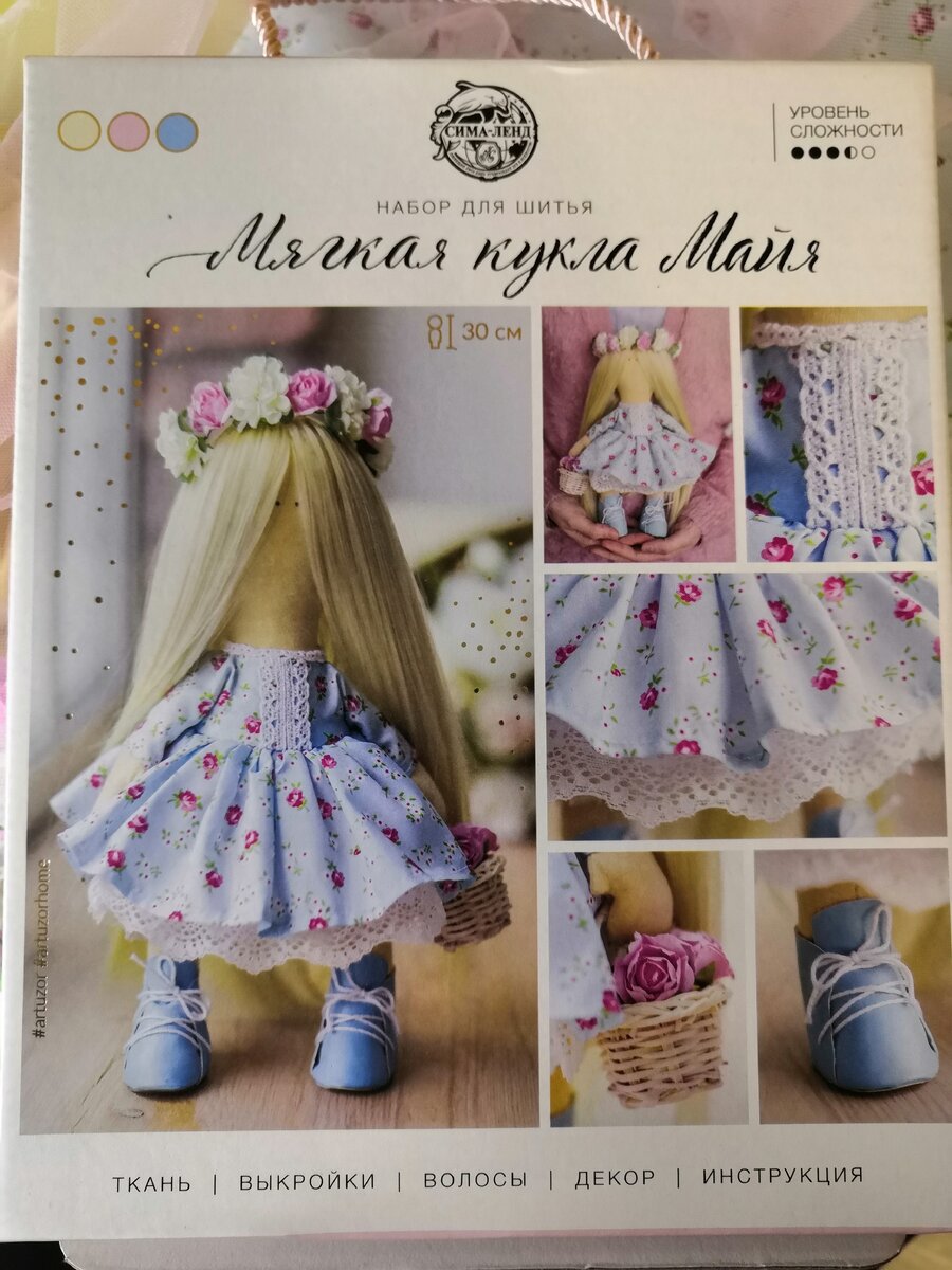 Доброго времени суток! Сегодня дошила новую интерьерную куколку Майя от SIMA LAND и ART UZOR. В набор входят ткани, волосы, кружева, шнурок для ботиночек, цветочки и готовая корзинка. Честно говоря, даже немножко расстроилась, т.к. интересно было бы цветочки и корзинку самой тоже сделать, а не готовые получить. Ткань на платье, честно говоря, мне не очень понравилась. Когда сделала горловину, то по краям обработала зажигалкой (главное держать огонь на расстоянии, в противном случае можно поджечь ткань) - после этого ткань не осыпалась. Ножницами зигзаг побоялась орудовать, т.к. горловина довольно узкая. Мне не очень нравится, что во всех инструкциях написано, что в начале полностью сшивается кукла, а потом уже одевается. Ведь зачастую такие наборы покупают начинающие, которые во многом не разбираются. Такое платье не одеть кукле, если голова уже набита, поэтому лучше первым делом одеть платье, а потом уже набивать голову. Также не понравилось, что оформление топа платья по инструкци